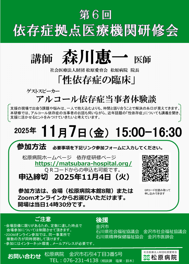 石川県依存症治療拠点医療機関として、依存症治療に関する支援者対象の研修会を開催させて頂きます。