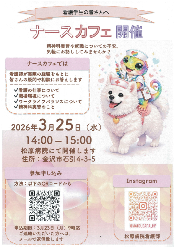 看護学生の皆さんへ ナースカフェ開催のお知らせ 2026年3月13日 お知らせ スライドニュース HOMEお知らせ看護学生の皆さんへ ナースカフェ開催のお知らせ 参加を希望する方は上のQRコードを読み込み、または下記をクリックして、申し込みフォームの入力をお願いします。参加申し込みはこちらから松原病院看護部のインスタグラムはこちらから